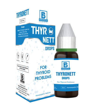 THYRONETT DROPS is a well proven combination of medicines, especially prepared for thyroid disorders, intoxication of thyroid glands with trembling of the hands, perspiration eventually leading to diarrhoea and emaciation, acts on hypothyroidism and its related symptoms, for muscular and general weakness, sensitive to cold, fatigue, digestive problems, mood changes, obesity, migraine etc.