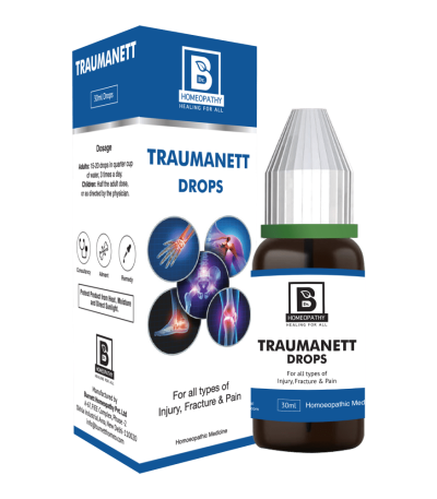 TRAUMANETT DROPS is a well proven combination of medicines prepared for all types of injury, fracture & pain, indicated in all types of stress, strain or sprain, caused due to the falls, accidents, weapons, hits, etc & non-union or mal-union of fractures, pain in old injuries, helps in wound healing process after injury or surgery.