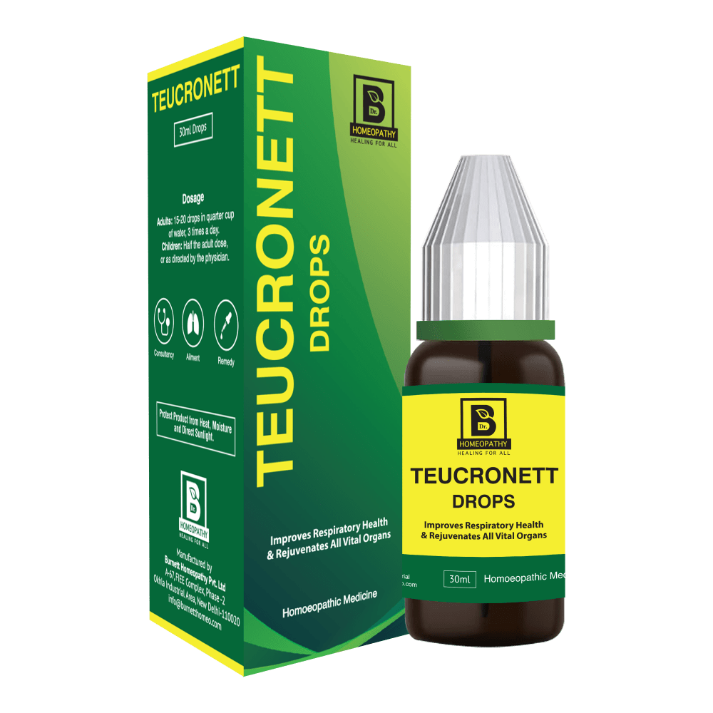 TEUCRONETT DROPS is a perfect combination of medicines that acts well on the immune system of the body to improve respiratory health, weakness of the parenchymatous organs, especially lungs & rejuvenates all vital organs. Nocturnal perspiration, sensitivity to cold, paleness of face, loss of vital fluids, weakness of back, disturbances of blood circulation of the respiratory organs & tendency to produce catarrhal infections.