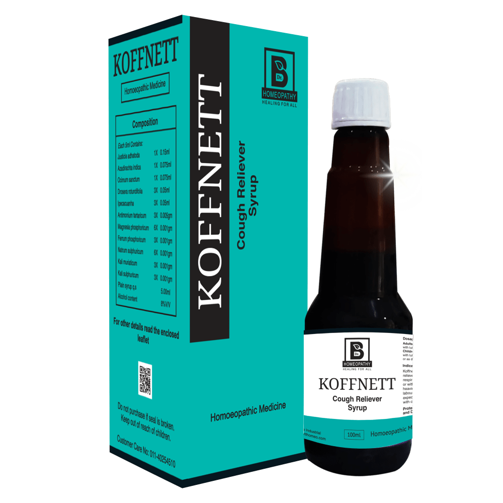 KOFFNETT SYRUP is a remarkable cough reliever, helpful in disorders of the respiratory tract. It helps relieve cough, dry or with expectoration, chest congestion with heaviness in chest, deep and hoarse voice, laboured breathing, difficulty in expectoration, laryngitis, dyspnoea, coryza with cough, loss of smell and taste.
