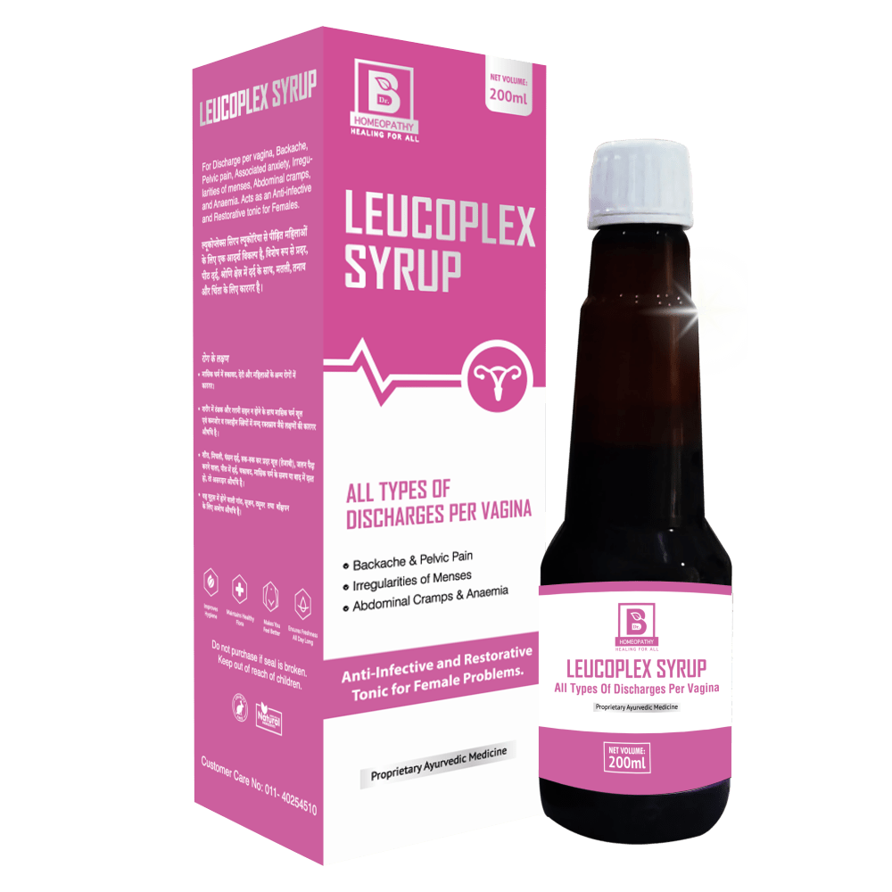 Leucoplex syrup acts as a restorative & anti-infective tonic for all types of discharges per vagina, backache, pelvic pain, associated anxiety, irregularities of menses, abdominal cramps, and anaemia, strengthens female reproductive organs, supports uterine function, improves general health, vaginal pain, discomfort, nausea and fatigue.